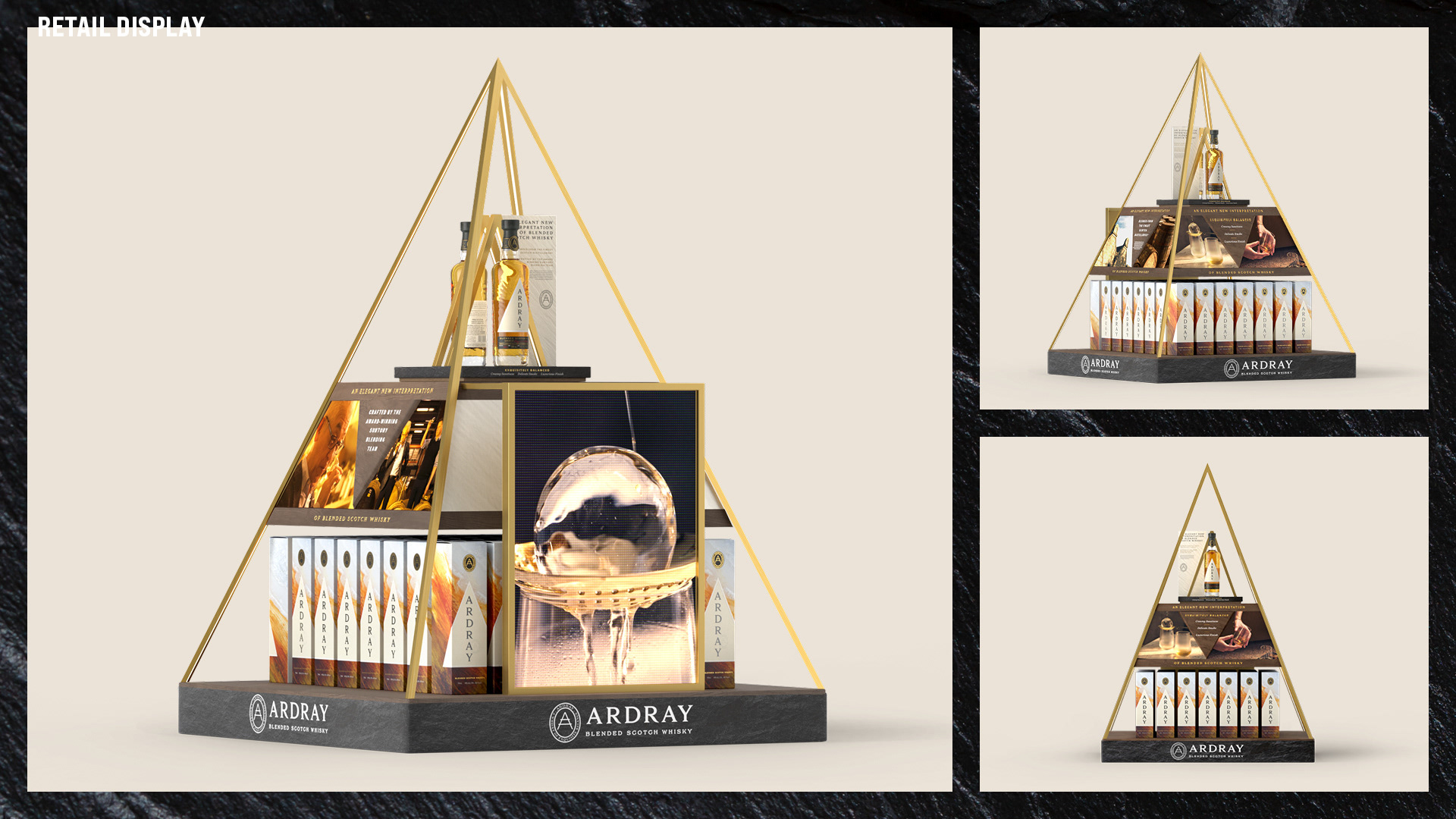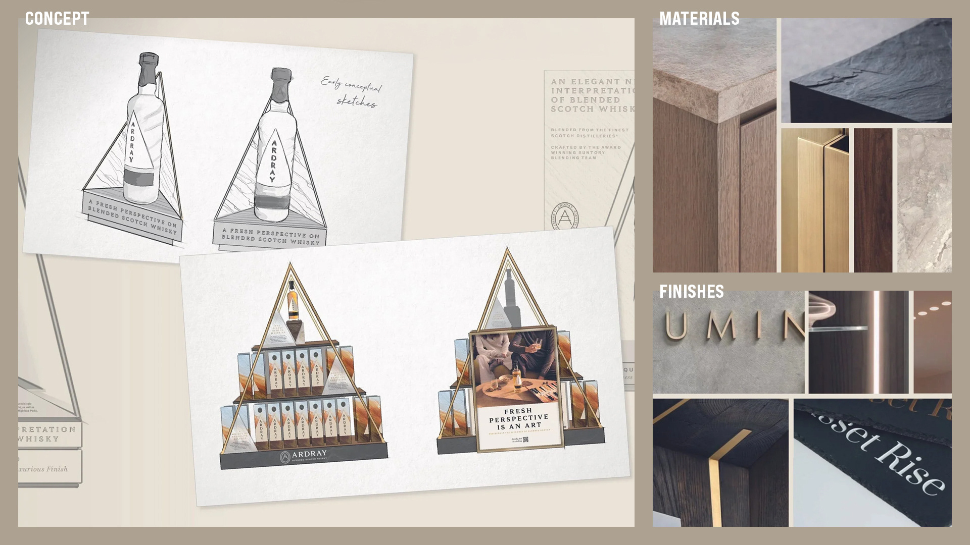 Ardray tasked us with creating the design and language for their global displays. I led my team in developing a set of elegant, premium displays. We were inspired by Ardray’s unique blend of craftsmanship and heritage, we looked to its visual identity – from natural materials and elegant finishes to the signature triangle motif – to shape a cohesive family of displays. To allow local markets to execute at scale, we designed 3 core assets suitable for varying levels of investment. A striking island unit with an integrated digital screen and two bottle glorifiers with hidden lighting, capturing the beautiful bottle at its best. Once we had wowed the client with our concepts, I supported local production teams on executing the first installation (at Singapore's world-famous Changi Airport), ensuring the quality of finish needed for a luxury brand. The installation was a success and more displays are continuing to launch in the world’s most prized airports.